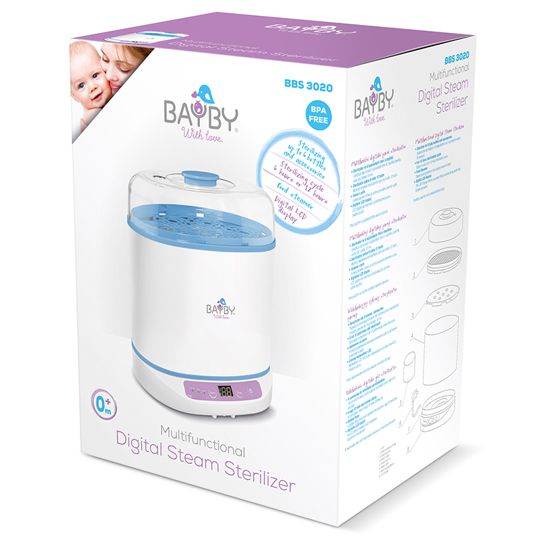 Pozwala na sterylizację 6 butelek dla niemowląt wraz z akcesoriami (smoczki, wieczka itd.) w przeciągu 10 min.